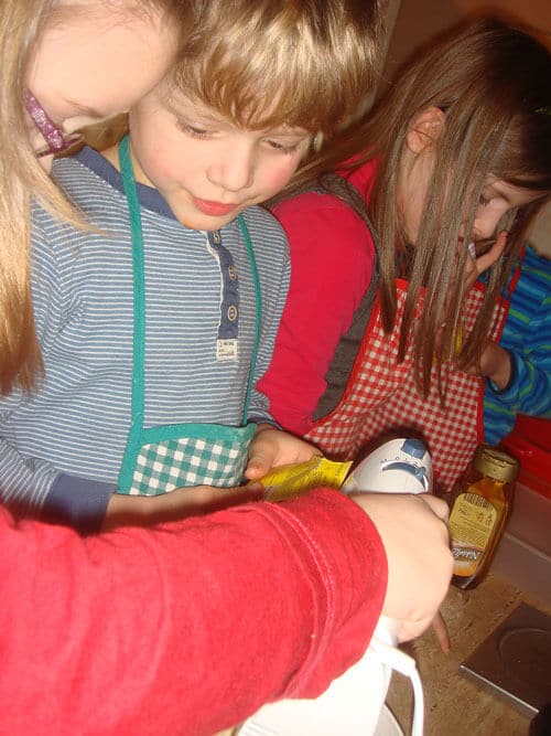 Gemeinsam wurden alle Utensilien bereit gestellt: Milch und Mehl, Backpulver, Vanillin-Zucker, Butter, Eier, eine Prise Salz und der Honig. Die kleinen Bäcker mussten natürlich erst einmal die Hände waschen, wurden mit den richtigen Schürzen ausgestattet, in zwei Gruppen aufgeteilt und dann konnte es auch endlich losgehen. Die Zutaten wurden in die Schüsseln gegeben, gerührt und vermengt, bis die Schüsseln randvoll mit Teig waren. Die kleinen Finger, die zwischendurch den Weg in die Schüsseln fanden um den Teig zu kosten, haben wir lieber nicht gezählt. Es wäre ja auch fatal gewesen, hätte der Teig nicht geschmeckt. Probieren gehört einfach dazu! gutshaus_48