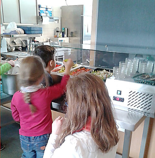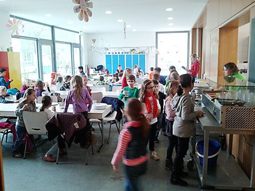 Schaut man während des Essens in die Mensa herein, wuseln immer ein paar Kinder herum, manche sitzen, manche laufen herum und andere holen sich einen Stuhl, Trinken oder Nachtisch. Das wirkt manchmal etwas durcheinander und laut, und doch ist es von uns irgendwie gewollt. Wir wollen unseren Kindern ermöglichen, dass sie ähnlich eines Familienessens gemeinsam sitzen, sich unterhalten und einander unterstützen können. Dabei können und sollen sich immer wieder neue Essenspartner zusammen finden. Sie können den Tag Revue passieren lassen oder etwas für den Nachmittag besprechen. Unsere Kinder dürfen sich in einer normalen Lautstärke miteinander unterhalten und müssen lediglich bei der Anmeldung für ein paar Minuten leise sein. Das klappt meistens sehr gut und wird von ihnen dankend angenommen. Eine Essensatmosphäre, bei der alle Kinder schweigend nebeneinander sitzen, können wir uns einfach nicht vorstellen. Gemeinsam in der Unterhaltung schmeckt das Essen einfach besser.