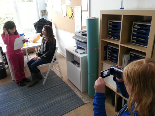 Zusätzlich musste noch einiges beachtet werden: es durfte nicht zu laut sein, sonst konnten die Fragen und Antworten nicht verstanden werden (bei uns im Hort ein ruhiges Plätzchen zu finden stellte sich als ganz schöne Herausforderung heraus). Außerdem muss jede/r, der/die gefilmt wurde zunächst um Erlaubnis gefragt werden, denn man darf andere Leute nicht ohne deren Erlaubnis filmen. So haben sich die Kinder auch gleich mit dem Recht am eigenen Bild auseinander gesetzt.