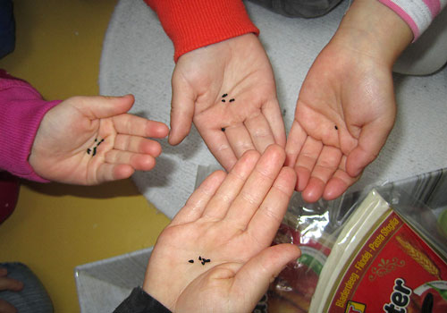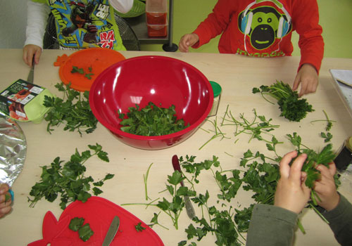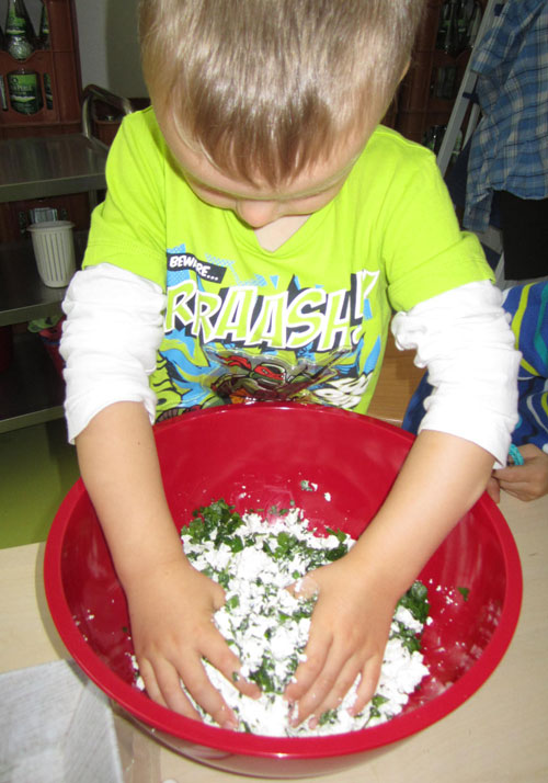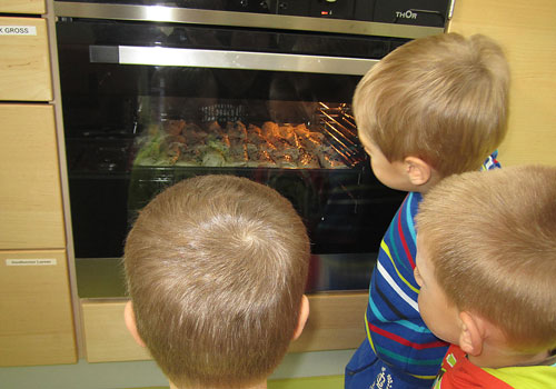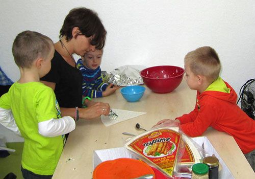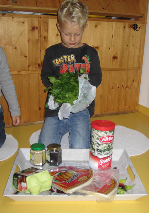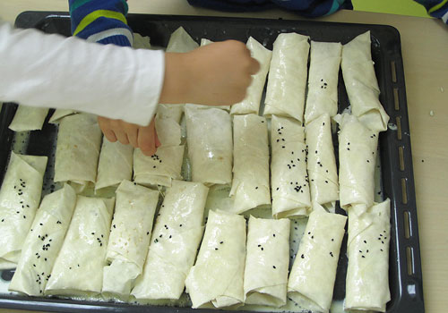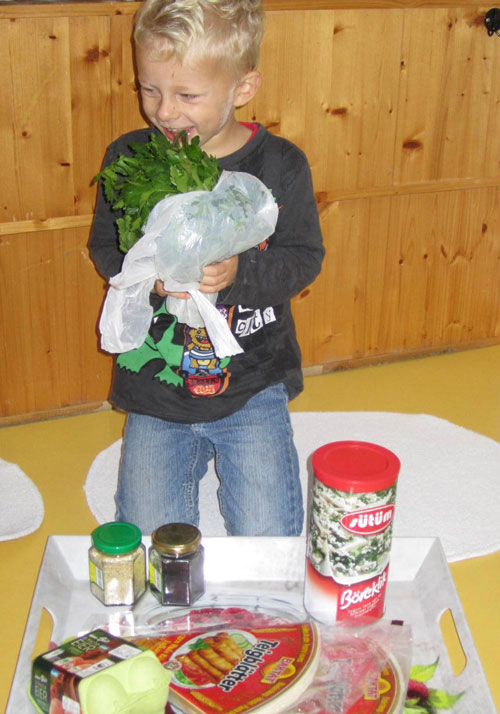 Wir Großen lernten heute die leckeren Zutaten des berühmten Böreks kennen. Interessant fanden wir die Petersilienblätter, den schwarzen Kümmel und Sesam. Es roch eigenartig und als wir eine Kostprobe machten, fanden wir schwarzen Kümmel fast noch leckerer als Sesam. Wir bereiteten die klebrige Schafskäse und Petersilienfüllung mit großer Begeisterung vor. Anschließend wickelten wir die Füllung in den Blätterteig. Der Höhepunkt: Wir bestreuen das Ganze mit Kümmel und Sesam. Macht das Spaß … 🙂 …und nun … schieeeebbbb in den Ofen rein, fertig soll der Börek sein.