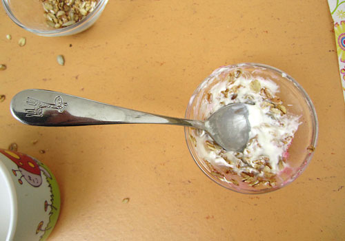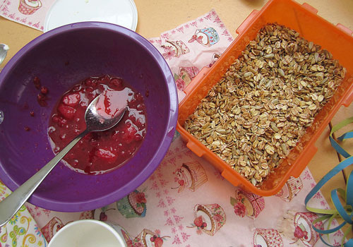 Unsere Ernährungsreise machte einen Zwischenstopp in der Türkei. Echter türkischer Börek mit einer besonderen Schafskäse-Petersilienmischung, eingewickelt in hauchdünne Blätterteigdreiecke und die Vielfalt der Körner (Müsli mit Joghurt, Erdbeeren) standen heute im Mittelpunkt unseres Hauses.