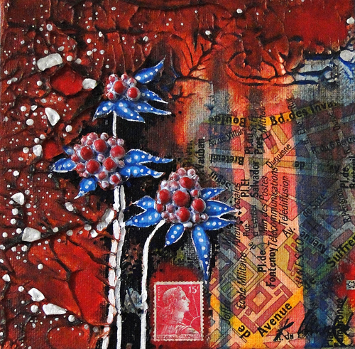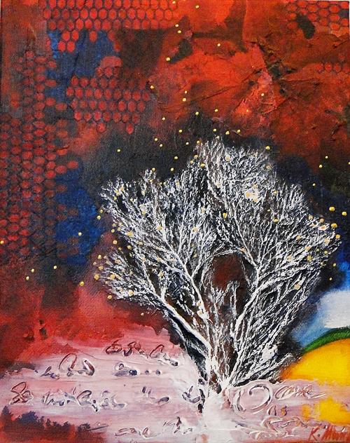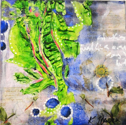 Katrin Munke ist Lehrerin, aber auch Mutter und Ehefrau und lernte durch die Kita im Haus das Gutshaus zu schätzen. Schon vor zwei Jahren nutzte sie die Räume für eine Ausstellung und auch in diesem Jahr war ein Termin für ihre schönen Bilder frei. 1976 geboren, verbringt sie ihre Kindheit in Dessau, Bernburg und Berlin. Schon frühzeitig wird ihr Interesse für Kunst und Musik geweckt und sie werden ständige Begleiter in ihrem Leben. Nach Abschluss des Lehramtsstudiums in Kunst und Musik an der Universität Potsdam 2001 unterrichtet sie an Berliner und Brandenburger Schulen. Seit 10 Jahren lebt die Familie in Lichterfelde und ist heimisch geworden. Als ich sie frage, ob sie vornehmlich Künstlerin oder Lehrerin ist, zögert sie keinen Moment um sich für die Lehrerin zu entscheiden. Die Kunst ist ihr Hobby, ihre Möglichkeit zu entspannen und die Bilder sozusagen ein Mehrprodukt. Sie lehnt den heutigen Kunstmarkt ab und findet die Preisfindung für die eigenen Bilder sehr schwer. So ist ihre Überzeugung gereift, dass sie lieber ein Bild für 100 Euro verkaufen möchte, als es in einer Ecke verstauben zu lassen. Da der Grunderwerb der Familie durch beide Elternteile gesichert ist, hat sie sich dazu entschlossen, den Erlös ihrer Bilder zu spenden. Dazu genüge ihr ein Blick in die Welt, der sie immer wieder unterstützenswerte Projekte finden lässt. Sie hat aber gemerkt, dass es Menschen manchmal schwer fällt, einfach nur zu spenden. Leichter wird es, wenn Besucher ein Bild, etwas Schönes für die eigene Wand oder ein außergewöhnliches Geschenk mit nach Hause nehmen können. So reifte diese Form, mit der sie immerhin zwei bis drei Bilder pro Ausstellung verkaufen und den Erlös spenden kann.