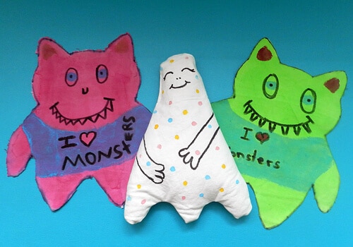 Sind die Stoffmonster ausgeschnitten, können diese bunt mit Textilfarben bemalt oder mit Hilfe kleinerer Stoffreste dekoriert werden. Hierbei immer darauf achten, dass keine leicht brennbaren Stoffe, wie Seide oder Polyester verwendet werden.