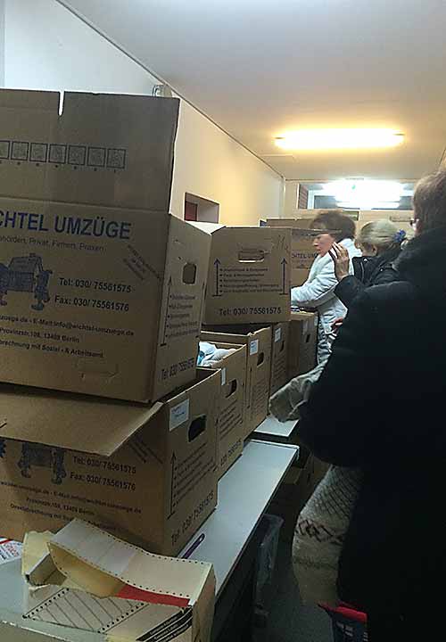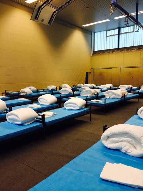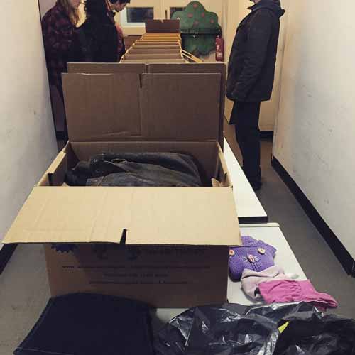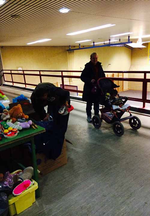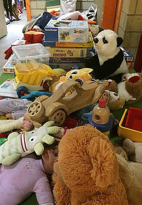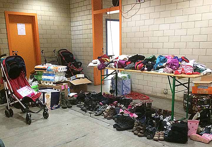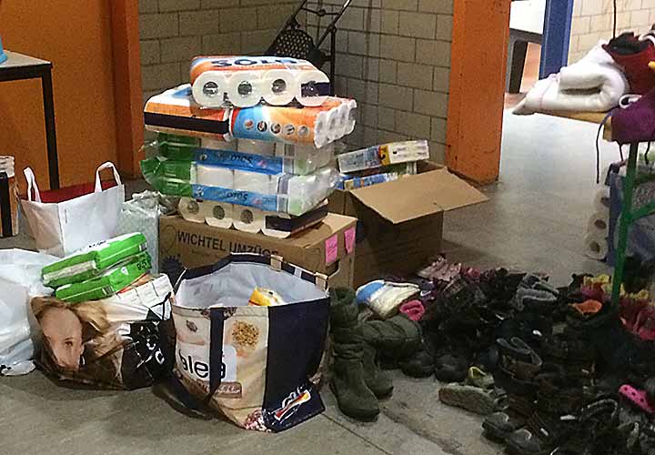 Als die Annahmestelle das zweite Mal öffnet, kommen Einzelpersonen und mehrere Autos vollgepackt mit allem, was die Familien entbehren können. Es wird schnell klar, dass alles nicht mehr gelagert werden kann und kurzentschlossen stehen mehrere Frauen zur Verfügung. Die Wagen werden wieder vollgepackt und fahren zur Halle. Einige Frauen fahren zweimal. In der Halle ist es noch relativ ruhig. Da die Heizung über Weihnachten ausgefallen war, mussten die ersten 40 Flüchtlinge anderweitig untergebracht werden, wurden nun aber wieder zurückerwartet. Drei Spendenräume wurden vorbereitet, unterteilt in Frauenkleidung, Kinderkleidung und Herrenkleidung. Parallel dazu kamen die ersten Flüchtlinge wieder in die Halle.