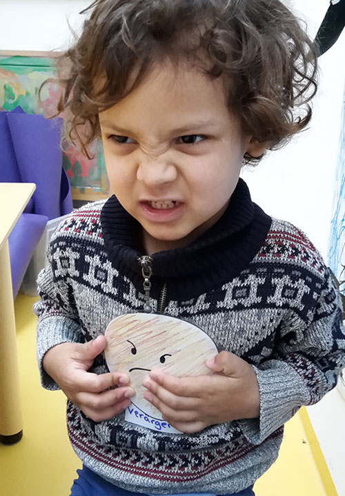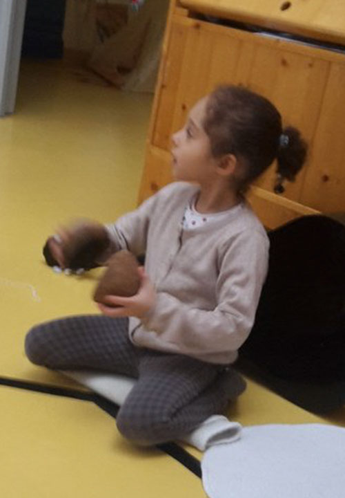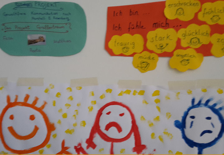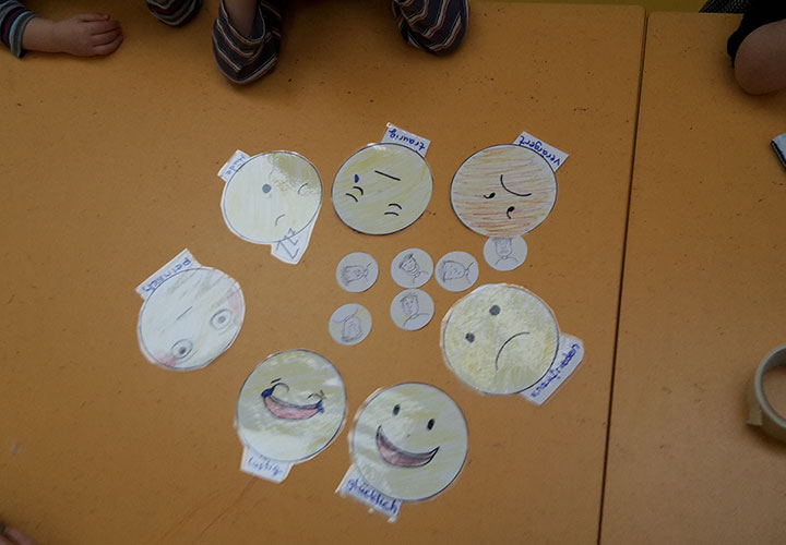 Wir Großen sprachen fiel über Gefühle und wir lernten die Giraffensprache (Marshall Rosenberg) ein wenig kennen. Das Giraffenkind hatte sich verirrt und konnte ihre Mutter nicht wiederfinden. Wie fühlte sich das Giraffenkind nur? Wir stellten ihr Fragen, die sie nonverbal beantwortete (nickend oder kopfschüttelnd) und versuchten ihre Gefühle zu benennen. Wir sprachen über unsere Gefühle, die wir manchmal empfinden. Wir fanden heraus, wann wir verärgert, glücklich, traurig … sind. Jeder erzählte über seine Gefühle. Gefühlskarten standen uns zur Verfügung. ->Wir können teilweise unsere Gefühle benennen und Gefühlslagen eines anderen erkennen. Es ist gar nicht so einfach.