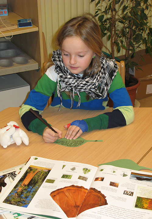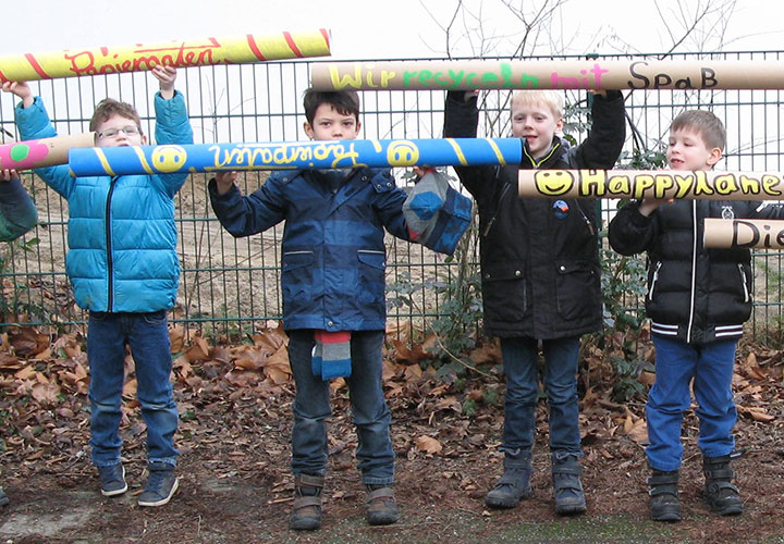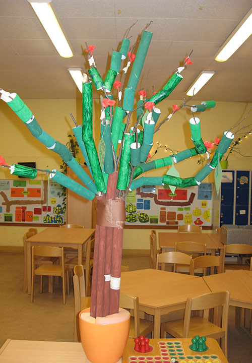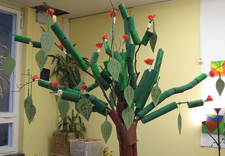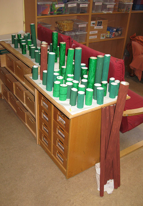 Die Happylaner legten im Januar – inspiriert von der Idee der Memmlinge – mit dem Papierbaum los. Wochenlang hatten Kinder, Eltern und Erzieher alte Papprollen gesammelt: Toilettenpapierrollen, Küchenrollen, Teppichrollen u.s.w. landeten nicht in der Mülltonne sondern bei uns. Diese wurden nun in der Hobbybude fleißig grün und braun angemalt und mit Zweigen aus dem Abenteuerland zu einem Baum zusammen gesteckt. Aus entsorgten Pappmappen (zufällig in grün) haben wir Blätter geschnitten, auf denen die Kinder alles aufschreiben konnten, was ihnen zum Thema Holz und Papier einfiel. Aus Bastelpapier hat Frau Gdwoska noch ein paar Blümchen gezaubert, das Ergebnis verschönert nun unseren Rezeptionsraum.