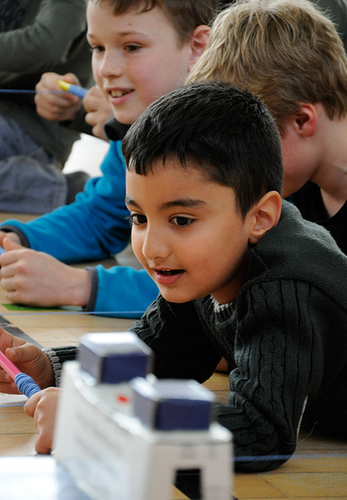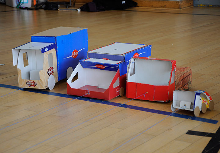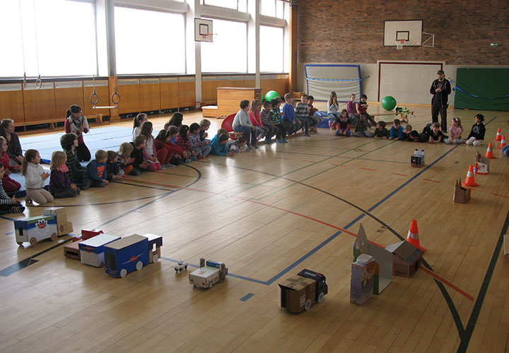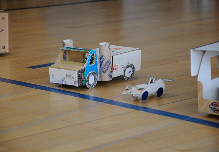 Am Mittwoch wurden die Kunstwerke nach einem Fotoshooting in die Turnhalle getragen, in der sich nach dem Mittagessen die Zuschauer sowie die aufgeregten FahrerInnen versammelten. An einer Linie wurden die Fahrzeuge aufgestellt, an der anderen Linie hielten die Kinder die Schnur in der Hand. Vier Mädchen der dritten und vierten Klasse hießen das gespannte Publikum herzlich Willkommen und erklärten die Regeln für das große Rennen.