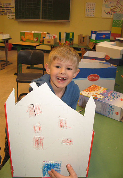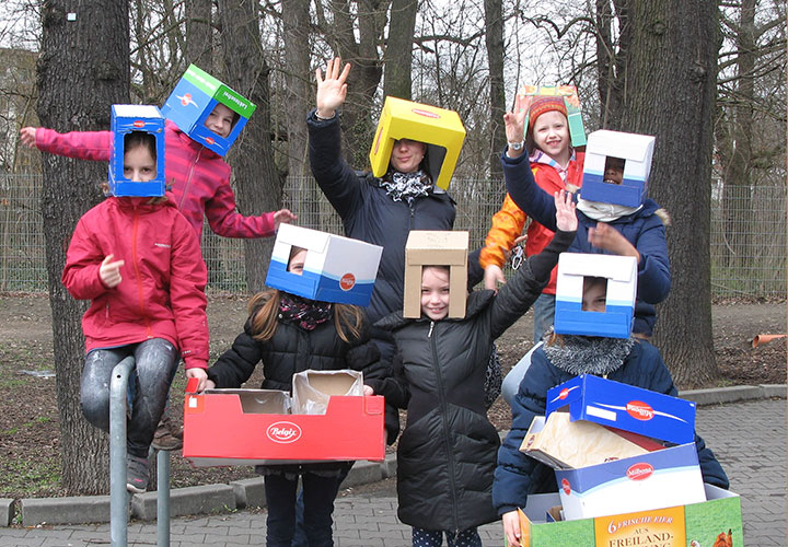 So wanderten die Kinder mit Frau Langguth zu Lidl, Pappkartons zu besorgen, die dadurch nicht entsorgt werden mussten, sondern dem Projekt zur Weiterverarbeitung dienten. Es bereitete den Happylanern als auch den Einkaufenden viel Freude, die Kartons als Kopfbedeckung zu entdecken. Auch der Rückweg wurde als Basis für Experimente genutzt: wie weit kann man mit einem schmalen Sichtfenster sehen, oder wie viele Schritte traue ich mich zu laufen, ohne etwas sehen zu können, weil der Karton „zufällig“ verrutscht ist…