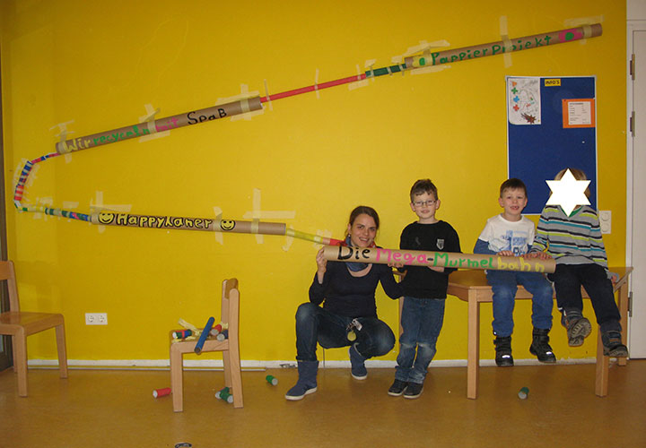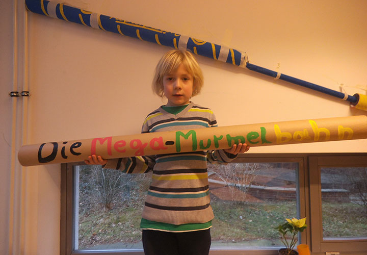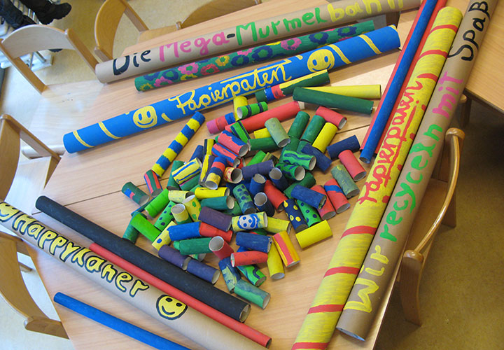 Es war gar nicht so einfach, die Rollen so zusammen zu stecken, dass die Murmel dann auch durch rollen konnte. Manchmal viel die Murmel durch ein Loch, manchmal blieb sie irgendwo, irgendwie stecken. Dann hieß es Rolle umkleben und noch einmal versuchen. So entstanden im Versuch und Irrtum Prinzip zwei riesengroße funktionierende Murmelbahnen aus Papprollen, die normalerweise im Müll gelandet wären. Die Kinder hatten großen Spaß am Bauen und noch viel mehr beim Spielen mit ihren Mega-Murmelbahnen.