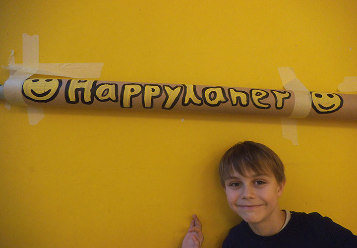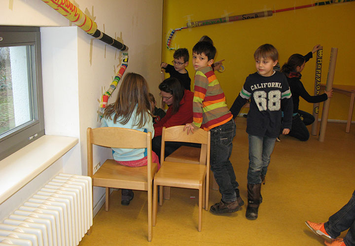 In den Winterferien starteten wir unser zweites Papierprojekt: Die Happylaner-Mega-Murmelbahnen! Wir hatten so viele Papprollen, dass wir diese nicht nur grün und braun sondern auch kunterbunt bemalt und beschriftet haben. Mit diesen Rollen, Kreppband und Holzmurmeln bewappnet machte sich eine Gruppe von ca. 15 Kindern auf den Weg in den Zitronenraum. Dort wurden erstmal Tische und Stühle beiseite gerückt um zwei Wände frei zu räumen, an denen sollten ja schließlich unsere Murmelbahnen entstehen.