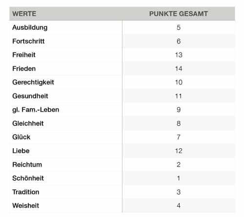 Wie sieht es mit uns selber aus? Welche Werte finden wir für uns persönlich grundlegend und lebenswert. Wie verändern sich unsere persönlichen Werte im Kontext mit einer Gruppe, einer Gesellschaft? Werte verändern sich mit steigendem Alter. Ist dem Jugendlichen die Freiheit sehr wichtig, mag sich der Senior vielleicht doch in den Traditionen ausruhen. Freiheit, Liebe, Gesundheit und Glück dürfte dabei keine Altersfrage sein. Für jeden einzelnen dieser vierzehn Werte lohnt sich eine eigene Debatte. Kann es Gesundheit ohne Glück geben oder Liebe ohne Weisheit? Interessant ist der Dialog zwischen Jugendlichen und Älteren. Aus dem Blick der Erwachsenen fehlen vielleicht Werte, die für eine Gesellschaft elementar sind. Wie sieht’s mit Sicherheit oder Wachstum aus? Werte, die die Jugend noch nicht interessiert. Sind Jugendliche noch enthusiastisch und wollen die Welt verändern, haben sich die Älteren mit einem realitätsnahem Blick vielleicht schon zurückgelehnt.