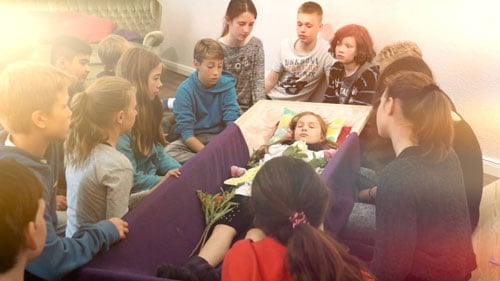 Etwas ganz Besonderes war auch der Besuch in einem Bestattungsinstitut. Es war merkwürdig (nicht auf unangenehme Weise), wie die Kinder diese Räume mit Leben füllten, wie sie die Atmosphäre aufsaugten und eine neue schufen. Im Zuge dieses Besuches wurde eines der Mädchen zurechtgemacht und legte sich in einen Sarg. Die anderen spielten dann die Trauer, sprachen mit der „Toten“, sagten sowohl vorbereitete wie spontane Dinge. Unter Anleitung der Bestatterin wuschen sie die „Leiche“, einige beteten, andere saßen nur da. Die im Film gezeigten Tränen sind natürlich nicht echt (Zwiebeln halfen dabei), aber dieser ganze Tag, diese ganze Stimmung war geprägt von Empathie und Sensibilität. Ernst und Spaß lagen nicht nur dicht beieinander, sondern liefen parallel. Übrigens waren natürlich alle Eltern im Vorfeld informiert und einverstanden.