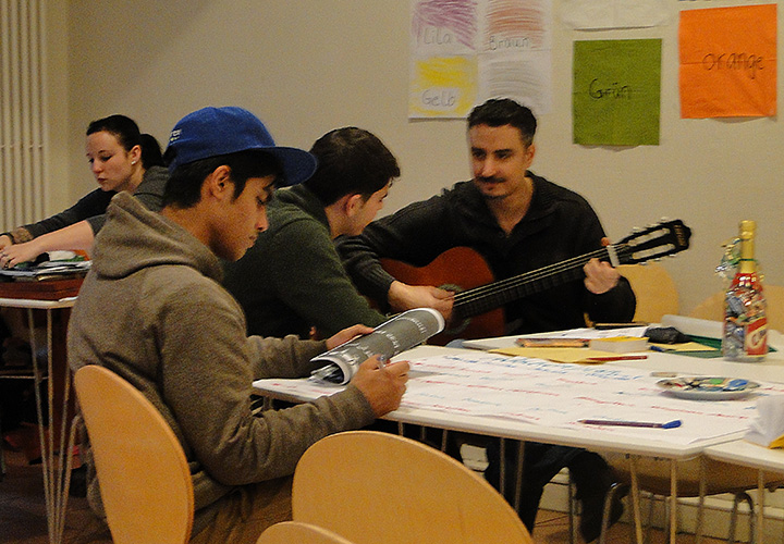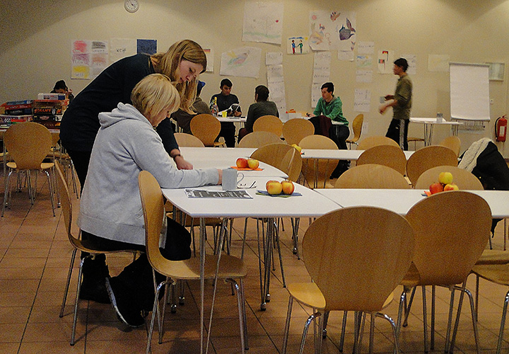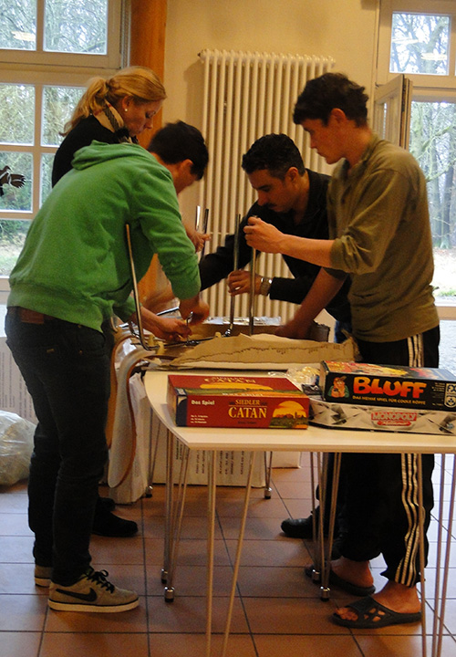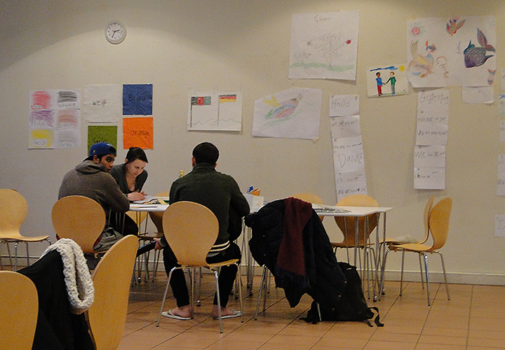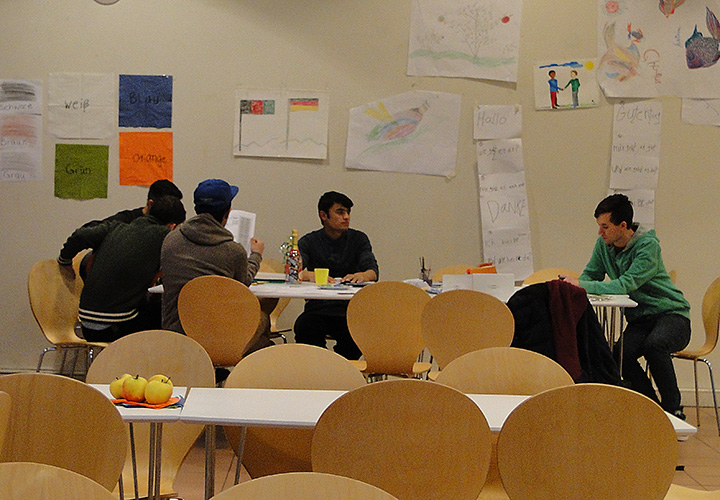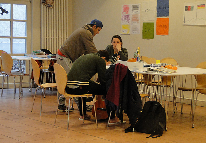 13 Mitarbeiter stehen rund um die Uhr für die Betreuung der unbegleiteten Jugendlichen zur Verfügung. Die ersten Jugendlichen sind eingezogen (was nicht zuletzt die Bettdecken vermuten lassen 😃 ) Manche helfen den Betreuern, die neuen Stühle zusammen zu schrauben, andere sitzen gemeinsam am Tisch und üben die ersten Wörter der neuen Sprache, sie telefonieren, essen gemeinsam und auch das Gitarrenspiel des Mitarbeiters zieht sie an. Andere Mitarbeiter besprechen sich und planen weitere Schritte. Die Tische mit den netten Apfelpyramiden lassen vermuten, das jetzt schon viel menschliche Wärme ins Haus eingezogen ist.