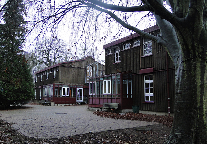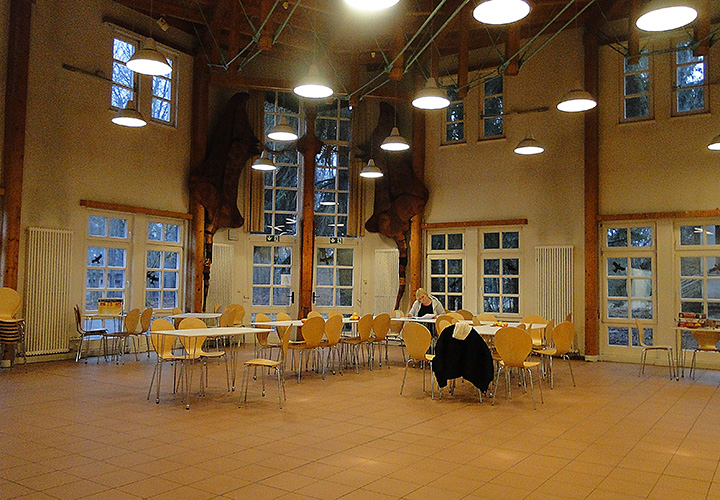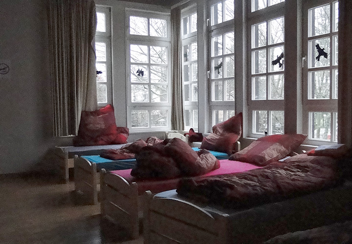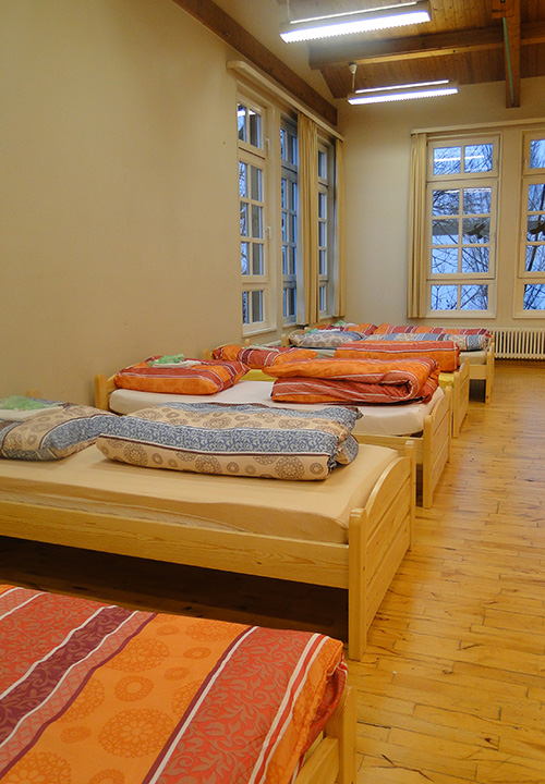 Wer die üblichen Bilder der Notunterkünfte in Sporthallen vor Augen hat, wird hier eines besseren belehrt. Auf einem großzügigen Außengelände ist die Einrichtung in hauptsächlich drei Wohngebäude unterteilt. Zwei weitere Gebäude können (noch) nicht genutzt werden. Auch bei dem trüben Wetter von heute, kann man sich gut vorstellen, wie schön es hier in der freundlicheren Jahreszeit sein muss. Freiflächen und Baumbestand laden geradezu zu Außenaktivitäten ein. Innen und Außen bestimmt viel Holz, große Fenster – also Licht und moderne Architektur die Optik. Die Räume sind hell und gemütlich. Die Schlafräume überschaubar und selbst die farbige Bettwäsche unterstreicht die heimelige Atmosphäre der Einrichtung. Der große Gemeinschaftssaal springt besonders ins Auge und lässt ahnen, was für schöne Gemeinschafts-Events hier veranstaltet werden können.