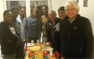 Bei „unseren Jungs“, wie wir Lehrer die Teilnehmer liebevoll nennen, waren wir im Januar zum Weihnachts- / Neujahrsessen in der Gemeinschaftsunterkunft am Ostpreussendamm eingeladen. Eritreisches Essen für Eritreer, Syrer, Deutsche. Die zwei Betten des Zimmers von B. und S. als Winkelsofa aufgestellt, ein paar Stühle dazu, eine Tafel aus drei Tischen dazwischen, 9 Leute passten so in die Runde.