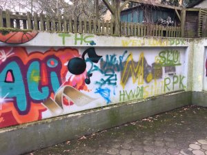 Welche Motive die oder den Täter zu dieser Aktion getrieben haben ist unklar. Wobei für mich persönlich fraglich ist, ob es überhaupt nachvollziehbare Gründe geben kann, eine Kinder- und Jugendeinrichtung zu beschmieren. Und nicht genug damit, dass sich Tags auf der Fassade befinden. Vor einiger Zeit haben wir im Rahmen eines Graffiti-Projekts mit Kindern und Jugendlichen wirklich coole Graffitis an eine Wand in unserem Außenbereich gebracht. Auch diese, von Kindern und Jugendlichen gemalten Bilder wurden übersprüht.