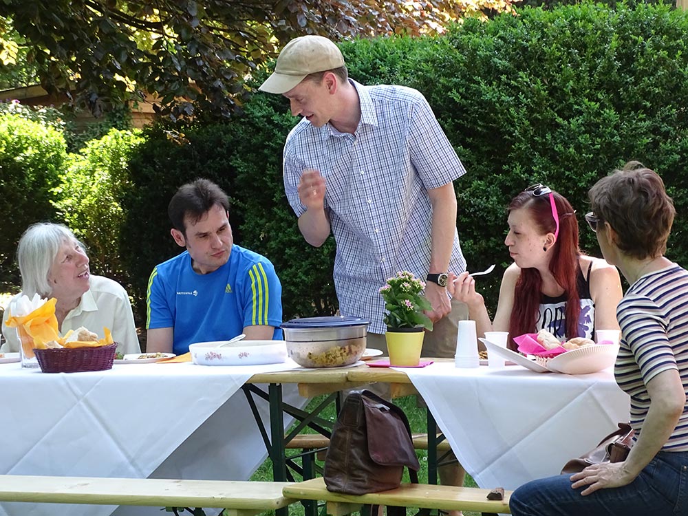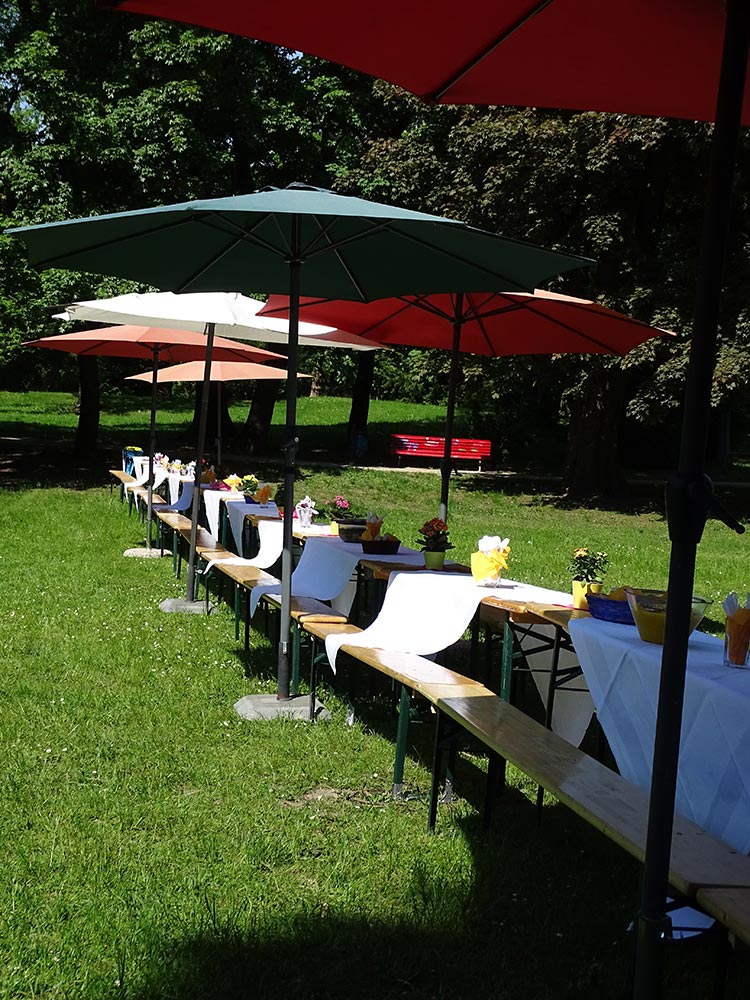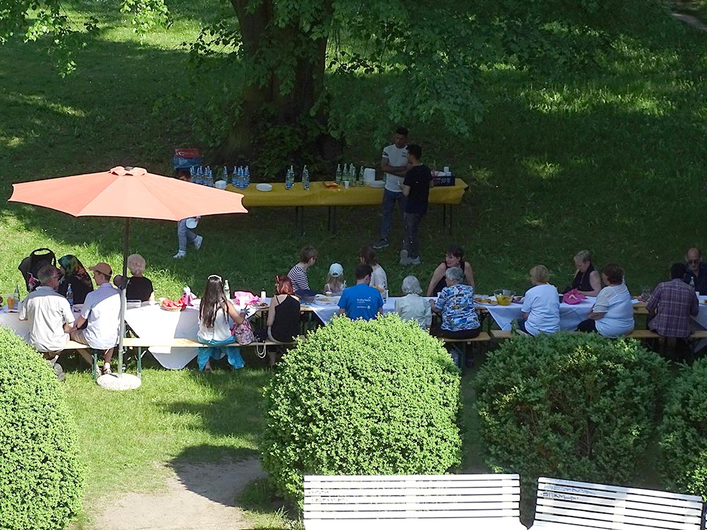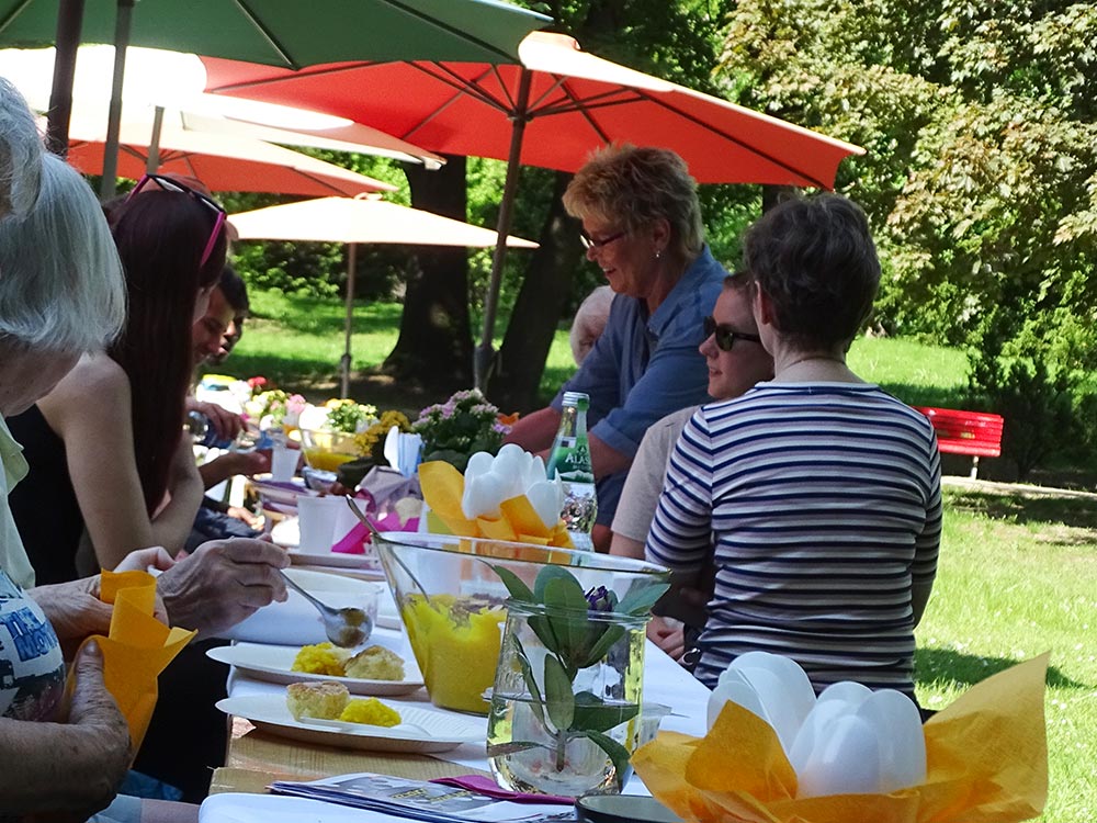 Das Fest der Nachbarn –„European neighbour’s day“ – findet jedes Jahr an einem Freitag Ende Mai statt. Europaweit werden an diesem Tag verschiedene größere und kleinere Feste mit allen Nachbarn und Nachbarinnen gefeiert. So steht es auf der Internetseite des Festes, dass seit vielen Jahren vom Verband für sozial-kulturelle Arbeit e.V. berlinweit organisiert wird. Der Sinn des Festes ist es, soziale Bindungen zu stärken, der Nachbarschaft ein Gesicht zu geben und soziale Kontakte zu festigen. Mitmachen können alle, die in einem Innenhof, Garten, einer Einrichtung, auf dem Gehweg oder Marktplatz einen Nachmittag mit Nachbarn organisieren möchten. Dabei ist die Ideenvielfalt in alle Richtungen offen. „Eine Tafel der Begegnung“ beispielsweise sollte es in diesem Jahr im Schlosspark Lichterfelde hinter dem Gutshaus Lichterfelde sein. Alle Nachbarn wurden eingeladen, eine Kleinigkeit zu Essen mitzubringen und sich gemeinsam an die Tafel im Schlosspark zu setzen.