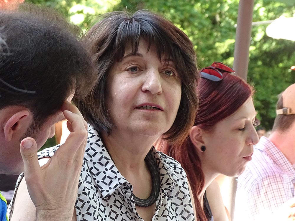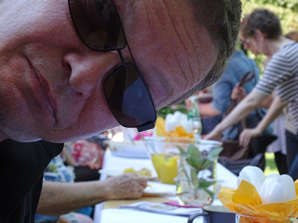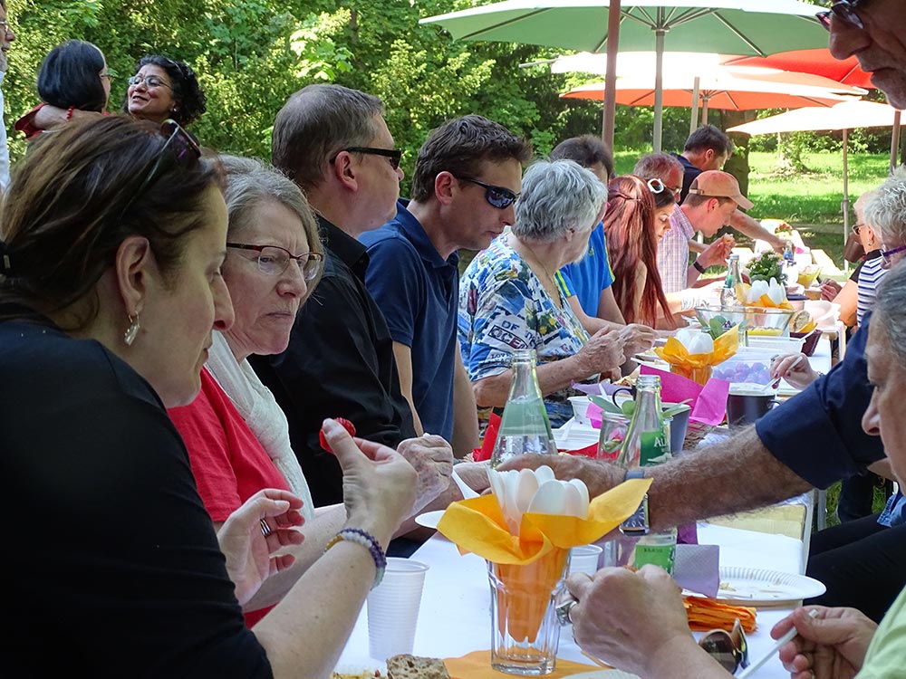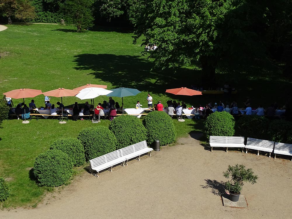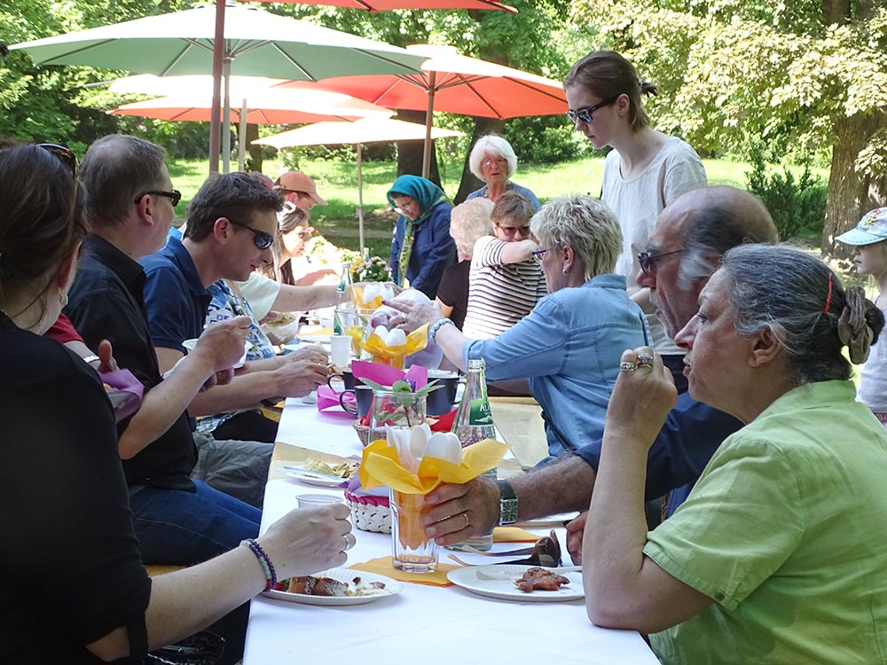 Die Vorraussetzungen waren ideal am Freitag Nachmittag, dem 19. Mai 2017. Die Sonne schien und gab den Schlosspark hinter dem Gutshaus Lichterfelde als Festplatz frei. Helfende Hände bauten eine lange Tafel auf, die mit Schirmen versehen und hübsch dekoriert zur gemeinsamen Tafel einlud. Ab 15.00 Uhr trafen die ersten Gäste ein und verteilten das mitgebrachte Essen auf den Tischen. Bevor sich jedoch ein Gast setzen konnte, bediente sich eine Krähe als erster Gast und sicherte sich ihr Stück Brot. Es hieß also wachsam sein, was aber nicht lange währte, weil bald mehr und mehr Nachbarn eintrafen, sich setzten und so die Tafel der Begegnung für die menschlichen Gäste einnahmen. Einzig die Getränke waren von Stadtteilzentrum Steglitz e.V. bereit gestellt wurden, das Essen ergänzte sich mit jedem neuen Gast. Obst, Süßes oder herzhafte Speisen kamen zusammen und es wurde schwer keinen Appetit zu haben.