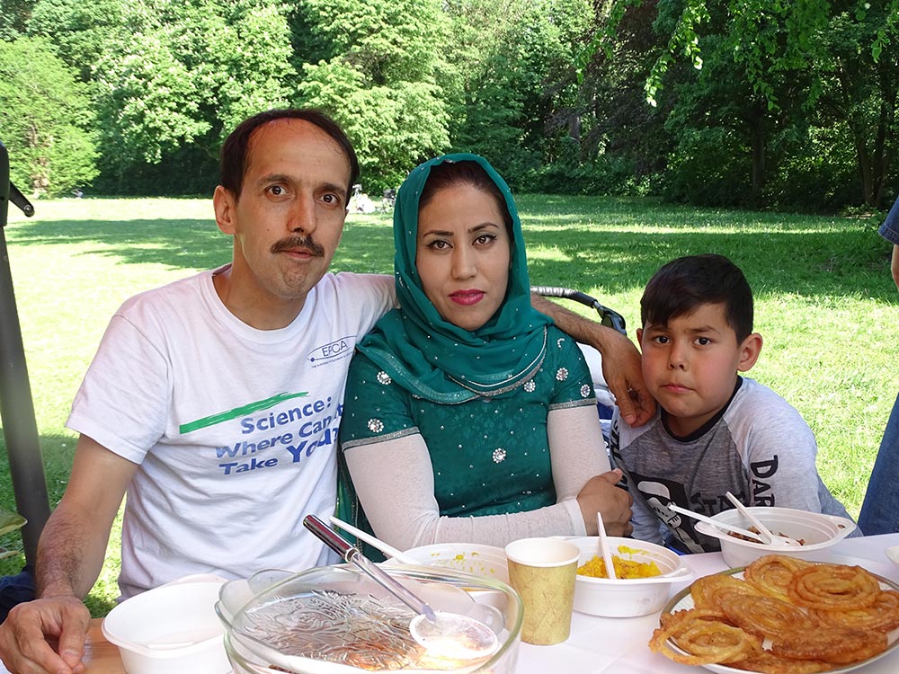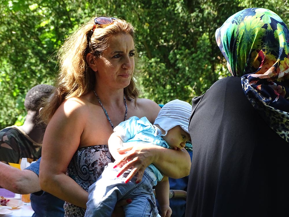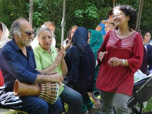 Bewundernswert warten die Trachten, die ein paar der Damen eigens für dieses Fest angezogen hatten und damit dem Fest einen besonderen Glanz gaben. Die Kinder spielten um die Tische, junge und ältere Männer nutzen die Wiese zum Ballspielen, es wurde gegessen, gelacht und schließlich gesungen. Herr Edan hatte seine Trommel mitgebracht und immer mal wieder nebenher kleine Rhythmen gespielt. Schließlich kann Frau Dehghani auf die Idee gemeinsam zu musizieren und platzierte Frau und Herr Edan in der Mitte der Tafel. Das war nun eine Sprache, die alle sehr gut verstehen konnten. Gemeinsam wurde gesungen, getanzt und geklatscht. Später übernahm eine afghanische Nachbarin die Trommel und spielte ihre Weisen. Eine serbische ältere Dame versuchte tanzender Weise die jungen Leute zum mitmachen zu animieren, was wieder zu viel Lachen führte. Nach einer Weile fingen die Männer von alleine an, sich zu den Klängen zu bewegen und ganz auf ihre eigene Weise zu tanzen.