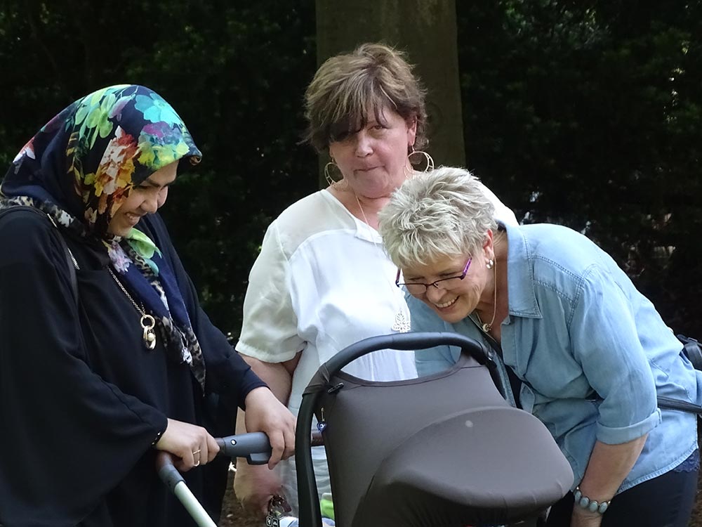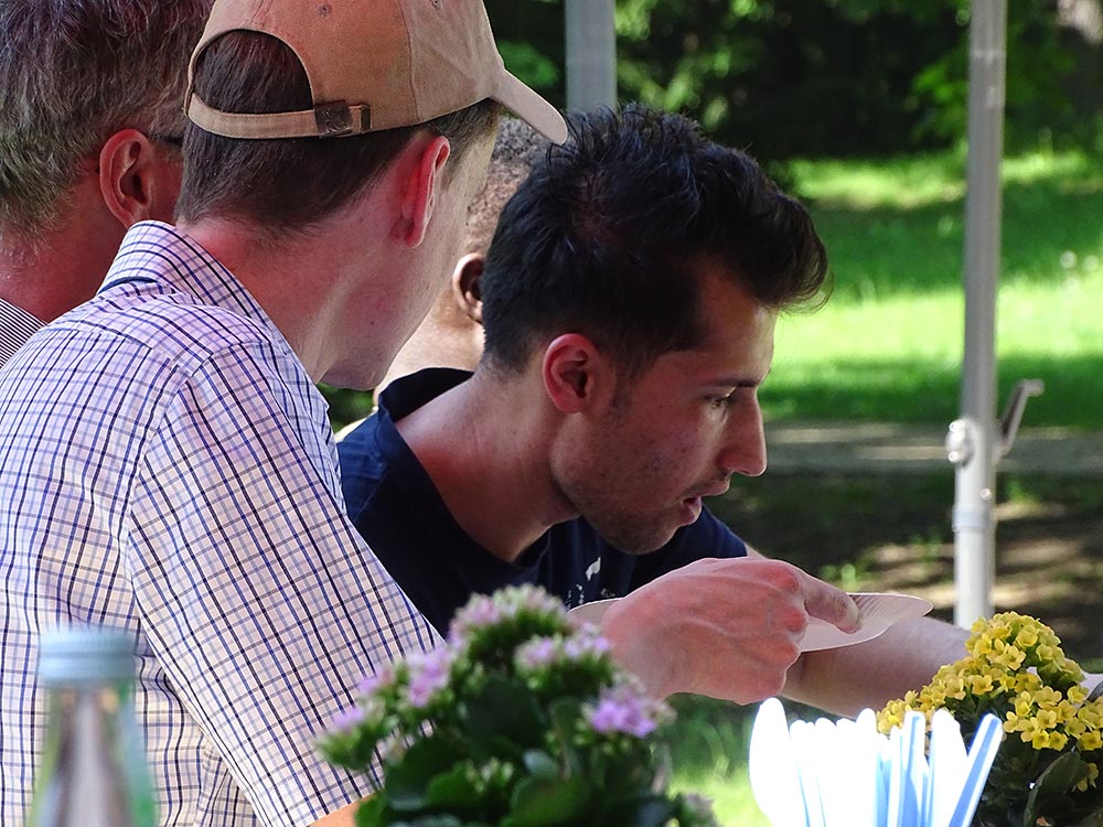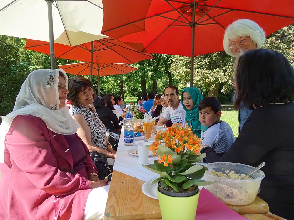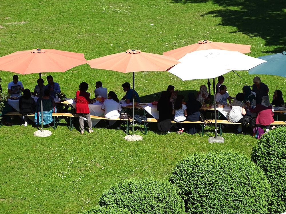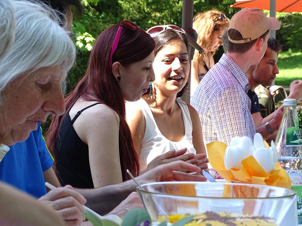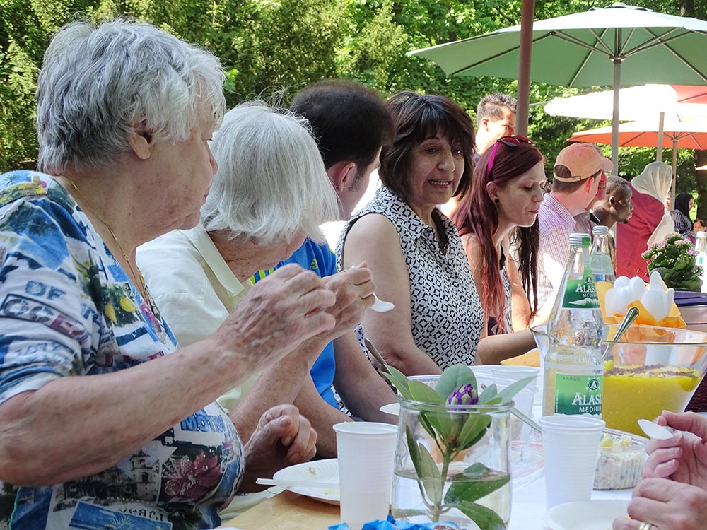 Waren anfänglich noch vorwiegend deutsche Nachbarn an der Tafel zu finden, änderte sich das nach kurzer Zeit als eine große Gruppe neuer Nachbarn, vorwiegend afghanischer Nationalität, dazu gesellten. Damit kam, wie man so schön sagt, Leben in die Bude. Das Essen ergänzte sich mit unbekannten Köstlichkeiten, die es zu probieren galt. Faszinierend war es zu beobachten, wie schnell sich alle untereinander mischten und Gespräche mit Sprache und Gesten möglich wurden. Es lag eine sehr fröhliche Stimmung über der Tafel und überall war das Lachen gegenwärtig.