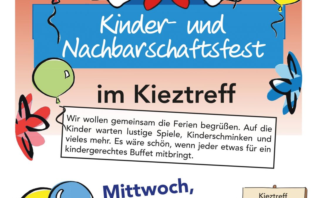 Wir wollen gemeinsam die Ferien begrüßen. Auf die Kinder warten lustige Spiele, Kinderschminken und vieles mehr. Es wäre schön, wenn jeder etwas für ein kindergerechtes Buffet mitbringt.