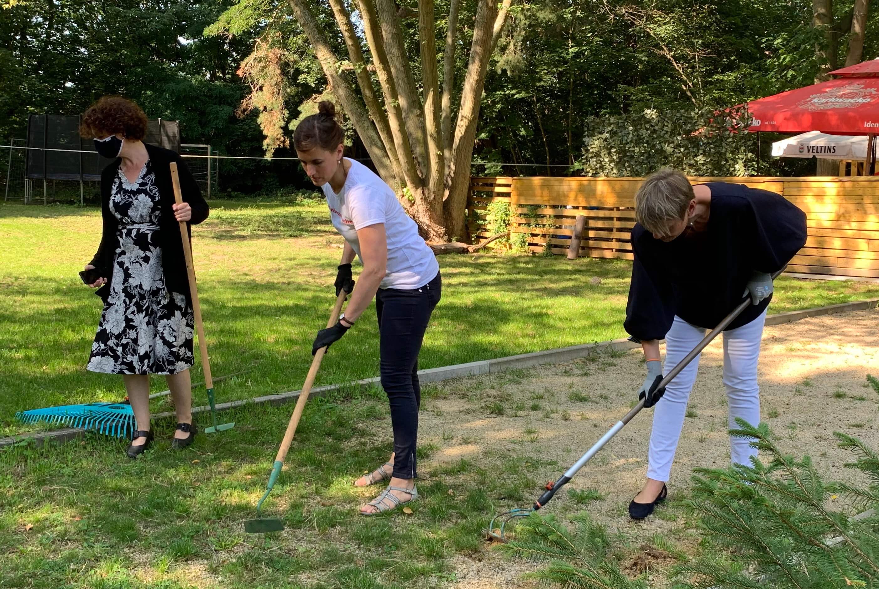 Bei perfektem Spätsommerwetter wurde in unserem Nachbarschaftsgarten gestern ganz fleißig gearbeitet. Es wurde Unkraut gejätet, ein neues Hochbeet gebaut und unser Geräteschuppen bekam ein neues Dach. Gemeinsam mit unseren handwerklich geschickten Hausmeistern, Kollegen aus verschiedenen Einrichtungen und engagierten Nachbar*innen, packten auch Senatorin Elke Breitenbach, Anne Jeglinski und Anika Goebel vom Paritätischen Berlin sowie Barbara Rehbehn und Renate Wilkening vom Verband für sozial-kulturelle Arbeit e.V. (VskA) fleißig mit an.