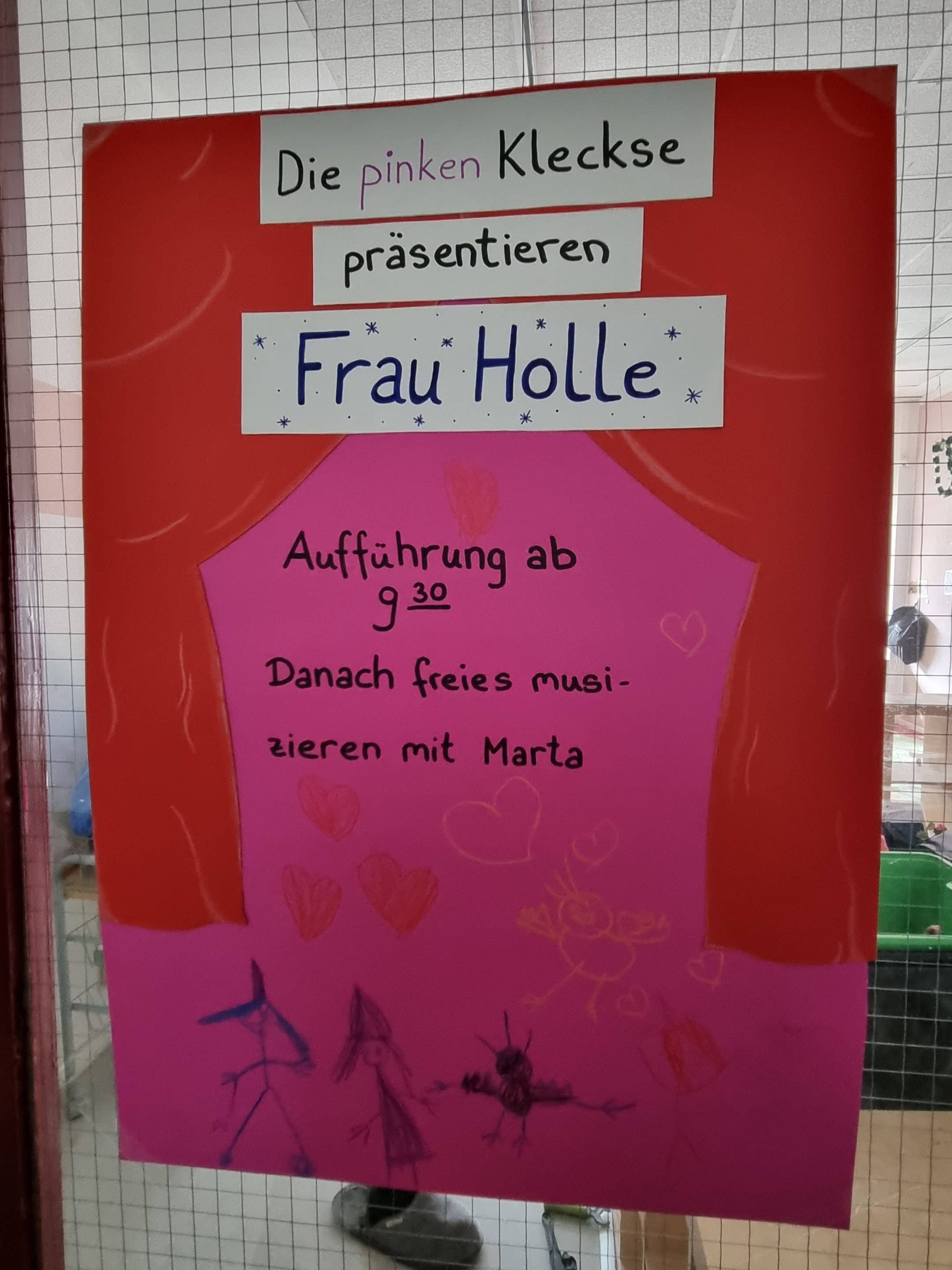 Am großen Tag ist viel los im Haus. Kinderlachen hallt durch die Flure, die gebastelten Plakate verzieren die Wände und die gute Laune ist spürbar. Die Altersgruppen sind ausnahmsweise aufgehoben. Große und Kleine spielen Eierlauf und Dosenwerfen – auch das auf den besonderen Wunsch der Kinder. Eine Gruppe hat außerdem eine Schattenspiel-Aufführung vorbereitet, auf dem Programm: Frau Holle.