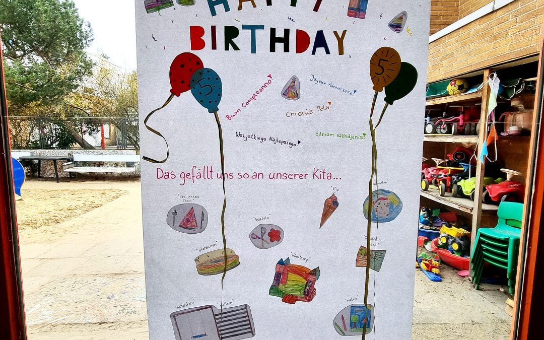 Sie gehört zum Leitbild der Kita: Sowohl die Kinder als auch die Pädagog*innen vor Ort, lassen sich gerne im künstlerischen Bereich aus. Dazu zählen: Basteln, Malen mit Fingerfarben und an Staffeleien sowie der Umgang mit Ton oder Gipsmaterialien. Beim Malen oder Basteln darf gekleckert werden. Auch bei der Vorbereitung zum Jubiläum. Projektleiterin Sarah Bohatschek erzählt: „Die Kinder wissen schon seit einiger Zeit, dass ihre Kita Geburtstag hat. Wir haben gemeinsam bereits in den letzten Tagen bunte Plakate gebastelt und uns überlegt, wie wir diesen besonderen Tag feiern möchten.“