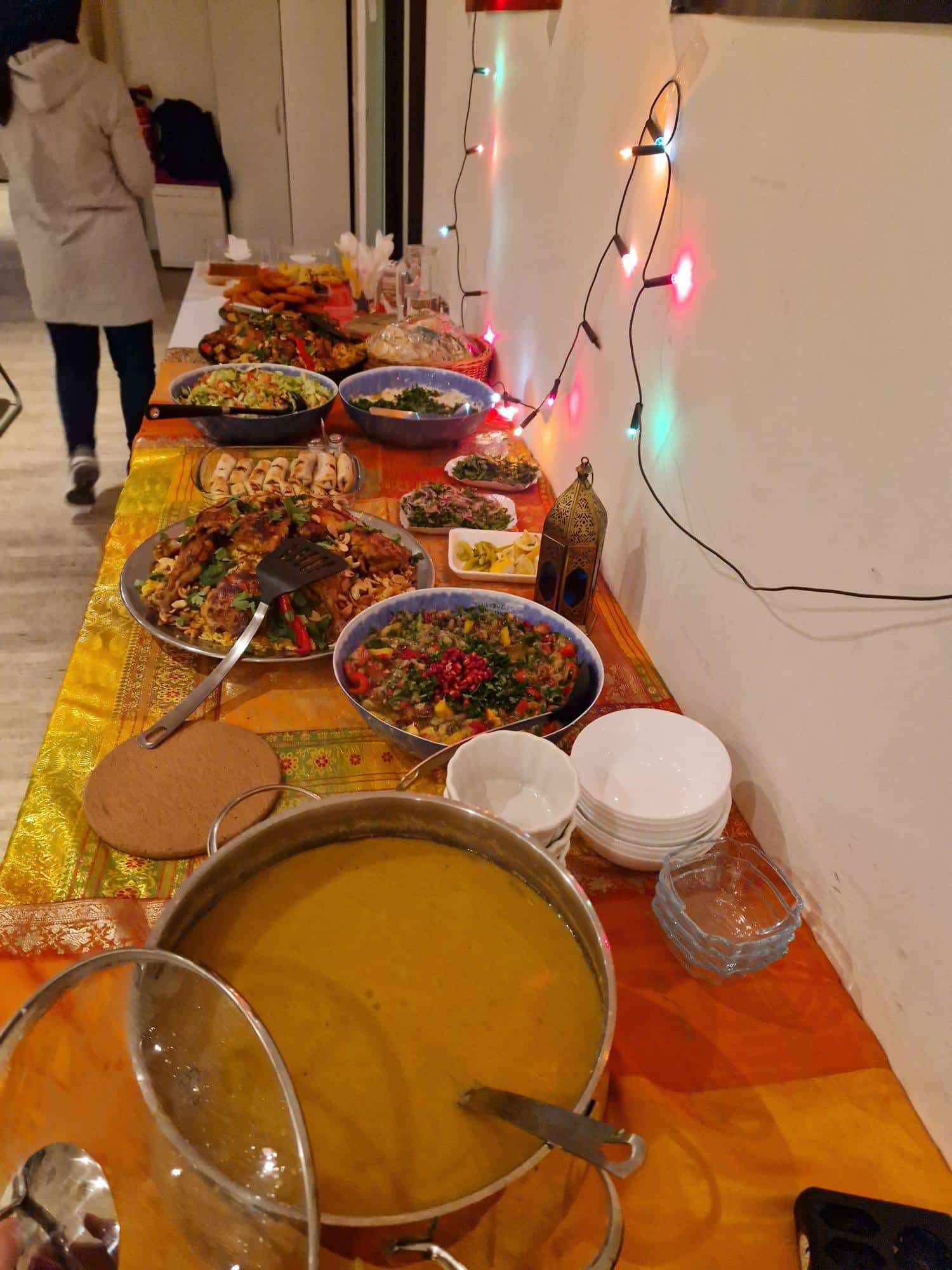 Das Essen wie auch die Dekoration vor Ort waren ein Gemeinschaftsprojekt. Die meisten Teilnehmer*innen brachten selbstgemachte Speisen oder Getränke mit. Nicht verwunderlich, dass das Buffett bunt und vielfältig war: Es gab Linsensuppe, verschiedene arabische Vorspeisen, Reis mit Hühnchen und viele unterschiedliche Süßigkeiten.