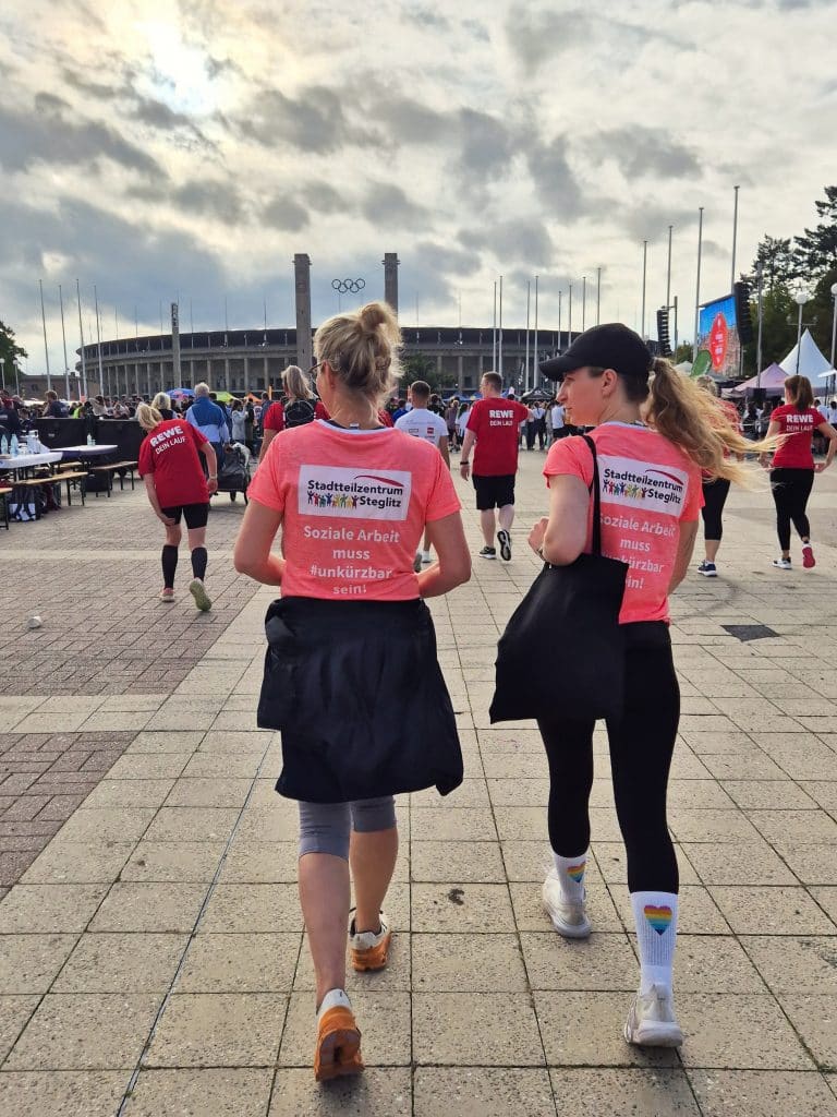 Mit rund 17.500 anderen Teilnehmer*innen machten wir uns auf den Weg durchs Olympiagelände: vorbei an Trainingsplätzen, durch Unterführungen, über Bodenwellen und schließlich hinein ins Olympiastadion. Einlauf auf die blaue Bahn – ein Moment, den wir so schnell nicht vergessen werden.