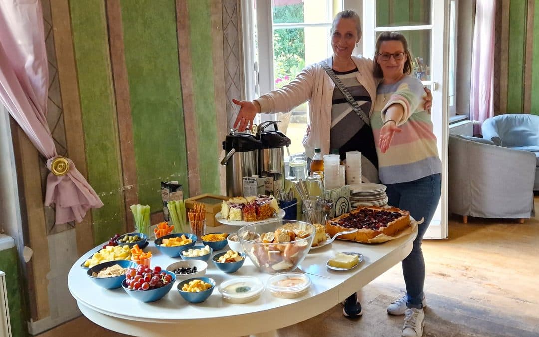 Kurz vor Beginn schüttete es noch wie aus Eimern, dann klarte der Himmel auf. So konnten alle die Terrasse des Gutshauses genießen, während die Kinder draußen spielten und drinnen ein reichhaltiges Buffet wartete.