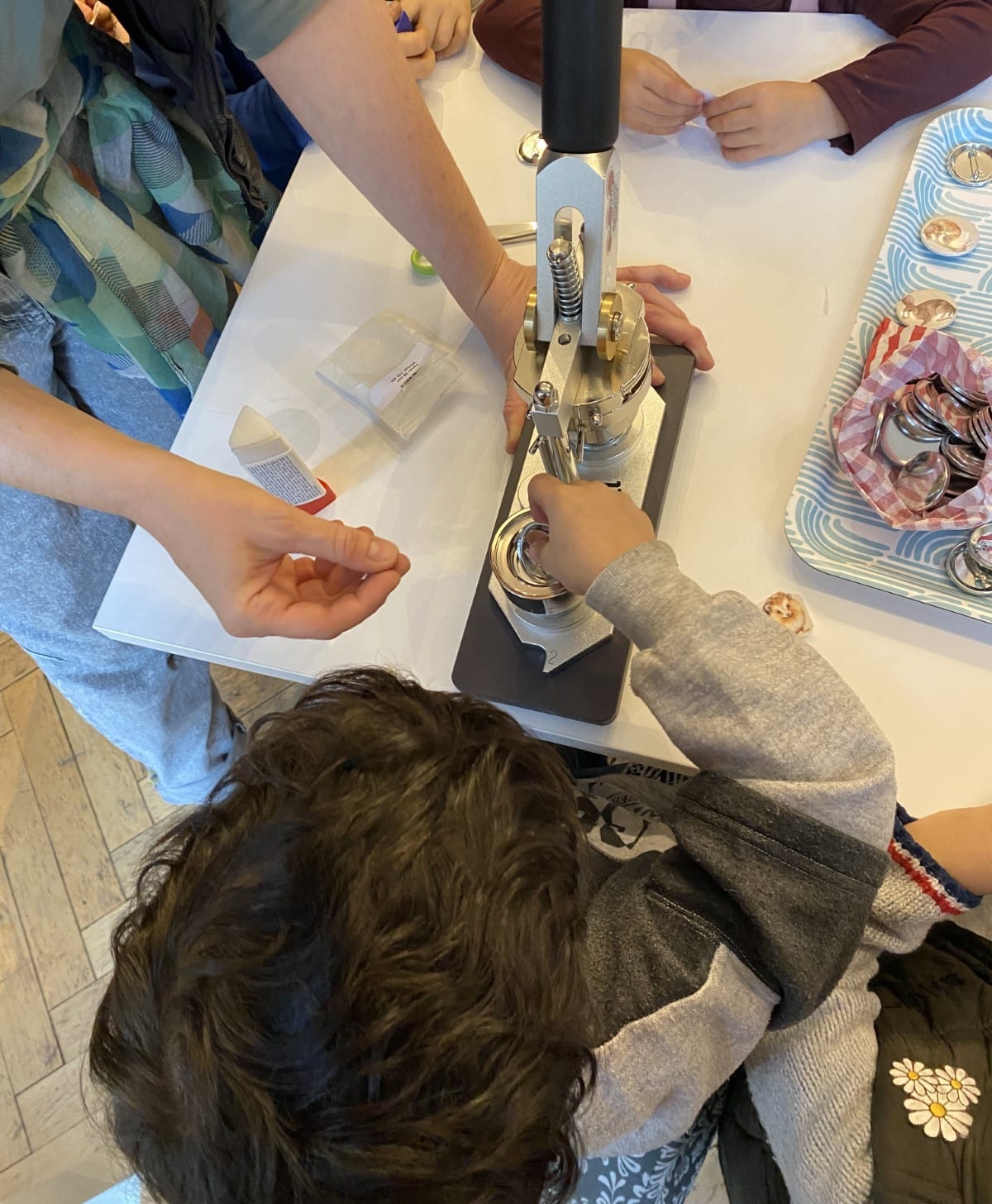 Nach dem gemeinsamen Essen wartete im Nachbarschaftsbereich des Gutshauses noch ein kreativer Abschluss: Beim Bastelangebot konnten sich die Kinder eigene Buttons gestalten – kleine Erinnerungsstücke an einen schönen, gemeinsamen Tag voller Dankbarkeit und Freude.