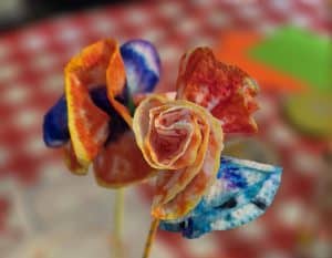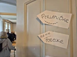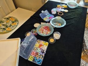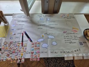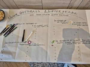Im Inneren des Gutshauses wird es kreativ: Schmuck entsteht an der Perlenbar, Papierblumen werden gefärbt und gestaltet. Gleichzeitig wird diskutiert und nachgedacht – über neue Ideen, Wünsche und Angebote für den Stadtteil. Die ausgelegten Umfragen laden dazu ein, das Gutshaus aktiv mitzugestalten.