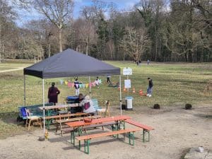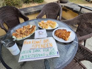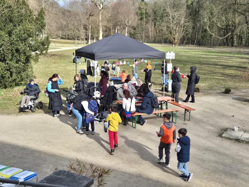 Während es zu Beginn noch ruhig ist, verändert sich die Stimmung schnell: Immer mehr Nachbar*innen und Interessierte kommen vorbei, bleiben stehen, setzen sich dazu. Auf der Terrasse entstehen bei Kaffee und Kuchen erste Gespräche, auf der Wiese wird gelacht, gesprungen und gemeinsam Zeit verbracht – geschützt unter Schirmen, aber offen für Begegnung.