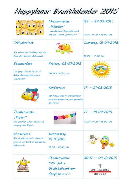 Fröhlich und voll Tatenkraft hat das Jahr 2015 in allen Einrichtungen begonnen und schon können wir uns auf alles freuen, was da kommen mag. Bei den Happylanern wird wieder richtig viel los sein: Feste, Themenwochen, eine Ferienreise und vieles mehr ... einzusehen...