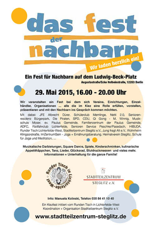 Ein Fest für Nachbarn auf dem Ludwig-Beck-Platz (Augustastraße/Ecke Holbeinstraße, 12203 Berlin) 29. Mai 2015, 16.00 - 20.00 Uhr Wir veranstalten ein Fest bei dem sich Vereine, Einrichtungen, Einzelhändler, Organisationen ... alle die im Kiez eine Rolle erfüllen,...