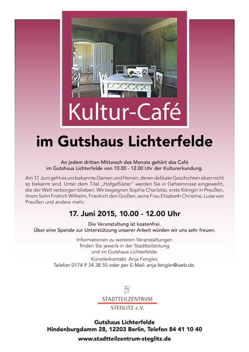 An jedem dritten Mittwoch des Monats gehört das Café im Gutshaus Lichterfelde von 10.00 - 12.00 Uhr der Kulturerkundung. Am 17. Juni geht es um bekannte Damen und Herren, deren delikate Geschichten eben nicht so bekannt sind. Unter dem Titel „Hofgefl üster“ werden...