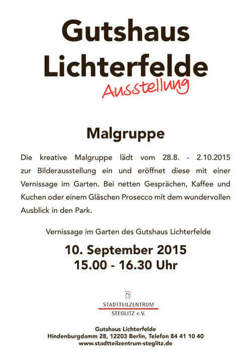 Die kreative Malgruppe im Gutshaus Lichterfelde lädt vom 28.8. – 2.10.2015 zur Bilderausstellung ein und eröffnet diese mit einer Vernissage im Garten. Bei netten Gesprächen, Kaffee und Kuchen oder einem Gläschen Prosecco mit dem wundervollen Ausblick in den Park....