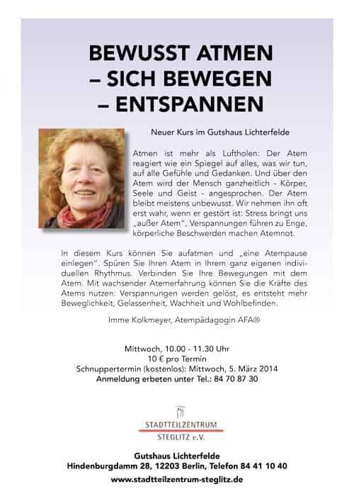 Neuer Kurs im Gutshaus Lichterfelde Atmen ist mehr als Luftholen: Der Atem reagiert wie ein Spiegel auf alles, was wir tun, auf alle Gefühle und Gedanken. Und über den Atem wird der Mensch ganzheitlich – Körper, Seele und Geist - angesprochen. Der Atem bleibt...