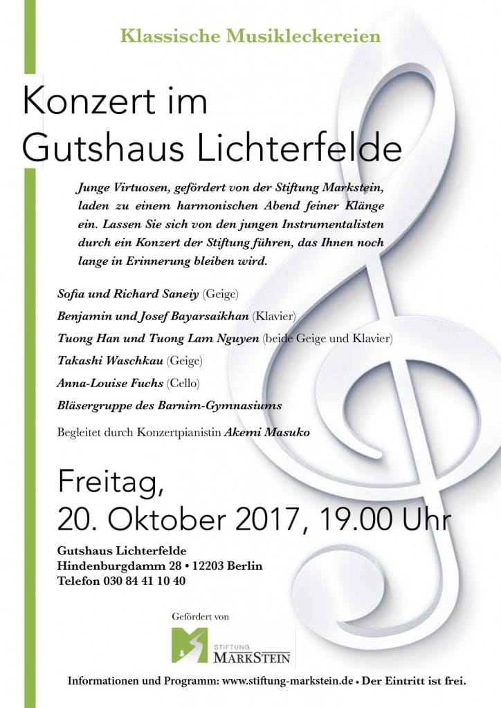 Junge Virtuosen, gefördert von der Stiftung Markstein, laden zu einem harmonischen Abend feiner Klänge ein. Lassen Sie sich von den jungen Instrumentalisten durch ein Konzert der Stiftung führen, das Ihnen noch lange in Erinnerung bleiben wird. Sofia und Richard...