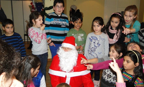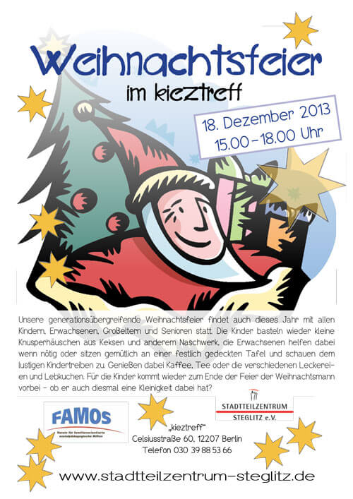 Schon zwei Tage vorher merkt man den Kindern an, die Aufregung steigt. Wenn alle Trennwände im „kieztreff“ beiseite geschoben, die Tische umgestellt und festlich eingedeckt wurden und der Baum mit seinen Kerzen hell erleuchtet ist … dann naht die Weihnachtsfeier....