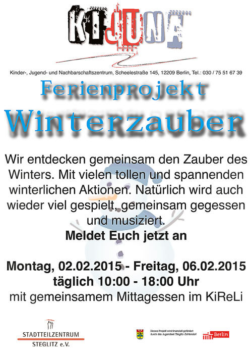 Wir entdecken gemeinsam den Zauber des Winters. Mit vielen tollen und spannenden winterlichen Aktionen. Natürlich wird auch wieder viel gespielt, gemeinsam gegessen und musiziert. Meldet Euch jetzt an Montag, 2.2.2015 - Freitag, 6.2.2015, täglich 10.00 - 18.00 Uhr...