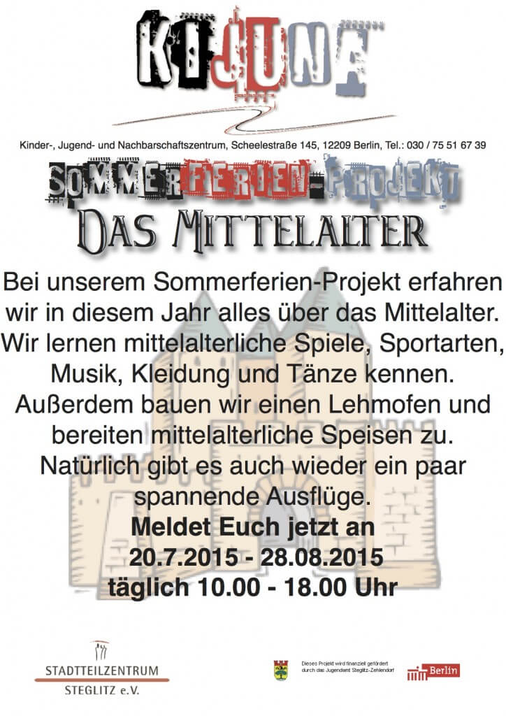 ... für das Sommerferienprojekt „Das Mittelalter“ im KiJuNa Vom 20. Juli (Heumond) bis 28. August (Augstmond) wandelt sich das KiJuNa - Kinder-, Jugend- und Nachbarschaftszentrum in eine mittelalterliche Mark um. Allerlei Burgfräulein, Junker, Mägde, Knechte,...