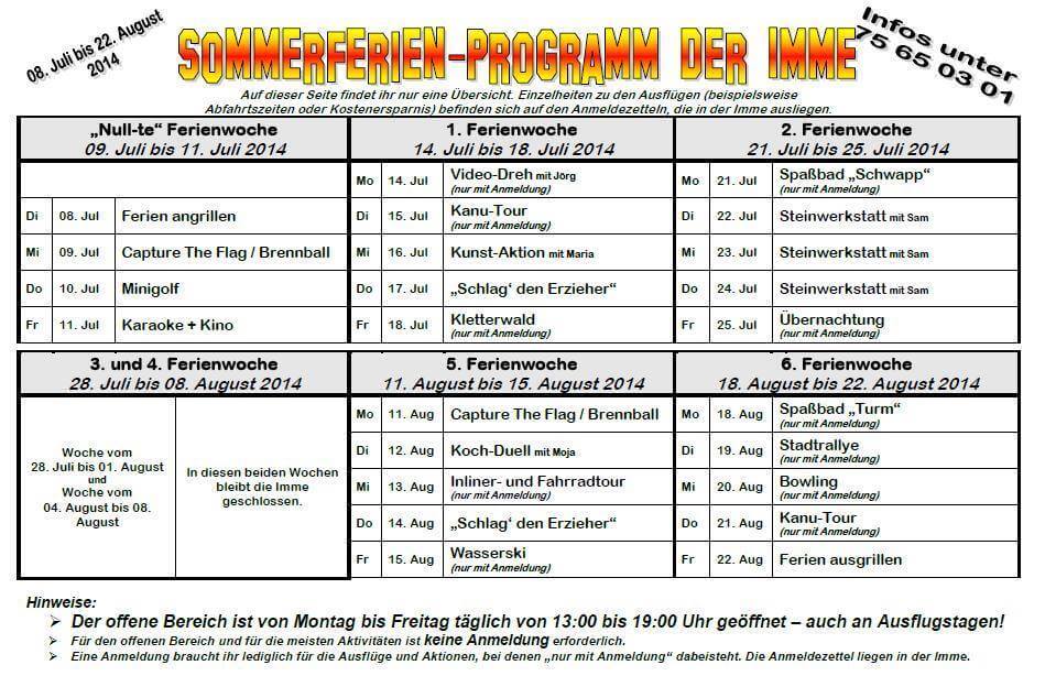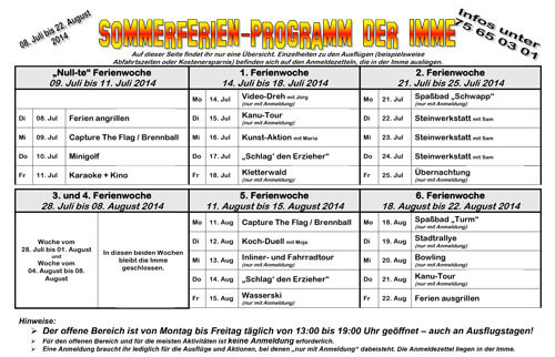 Auch in diesen Sommerferien bietet das Kinder- und Jugendhaus Immenweg wie jedes Jahr ein abwechslungsreiches Ferienprogramm. Die Bandbreite geht von Spaß-Aktionen („Schlag‘ den Erzieher“, Kochduell, Karaoke, Capture-the-Flag) über Kreativaktionen (Steinwerkstatt,...