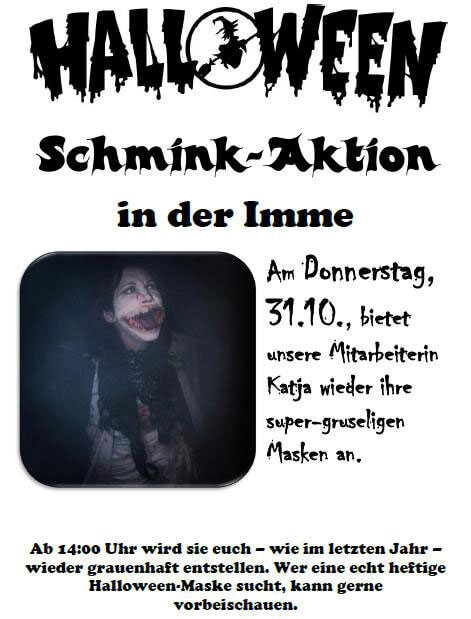 Am Donnerstag, 31. Oktober – also an Halloween – findet im Kinder- und Jugendhaus Immenweg zum zweiten mal eine Schminkaktion statt. Schon im letzten Jahr hat unsere Mitarbeiterin Katja Kutics ihre Schminkkünste, die sie bei den Horror-Nächten im Filmpark...