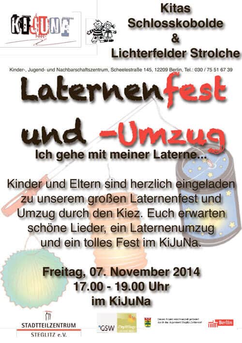 Ich gehe mit meiner Laterne ... Kinder und Eltern sind herzlich eingeladen zu unserem großen Laternenfest und Umzug durch den Kiez. Euch erwarten schöne Lieder, ein Laternenumzug und ein tolles Fest im KiJuNa. Freitag, 7. November 2014 von 17.00 - 19.00 Uhr im...