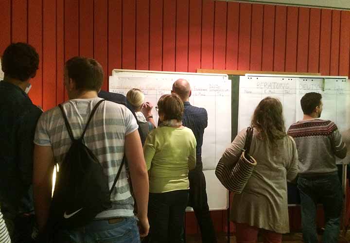 Kurz vor Beginn wurden aus angrenzenden Räumen noch zusätzliche Stühle geholt. Das Stadtteilzentrum Steglitz e.V. hatte zum 1. HelferInnen-Treffen für die Koordination der Ehrenamtlichen für die Wohnanlage am Ostpreußendamm 108 eingeladen. Der große Saal im KiJuNa...